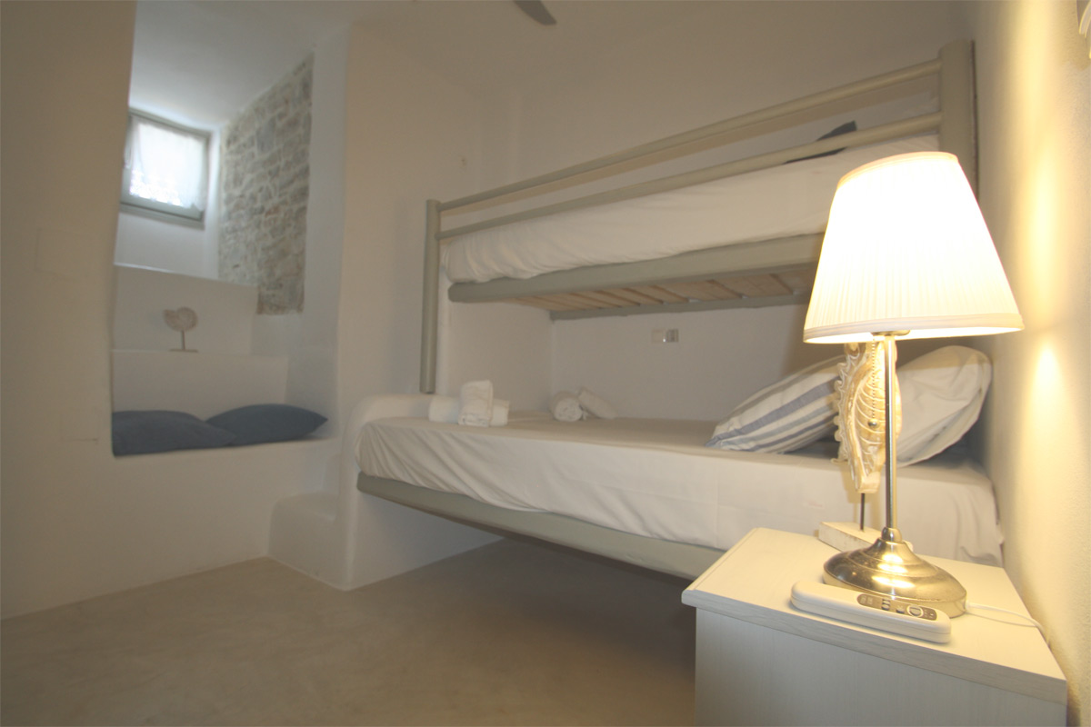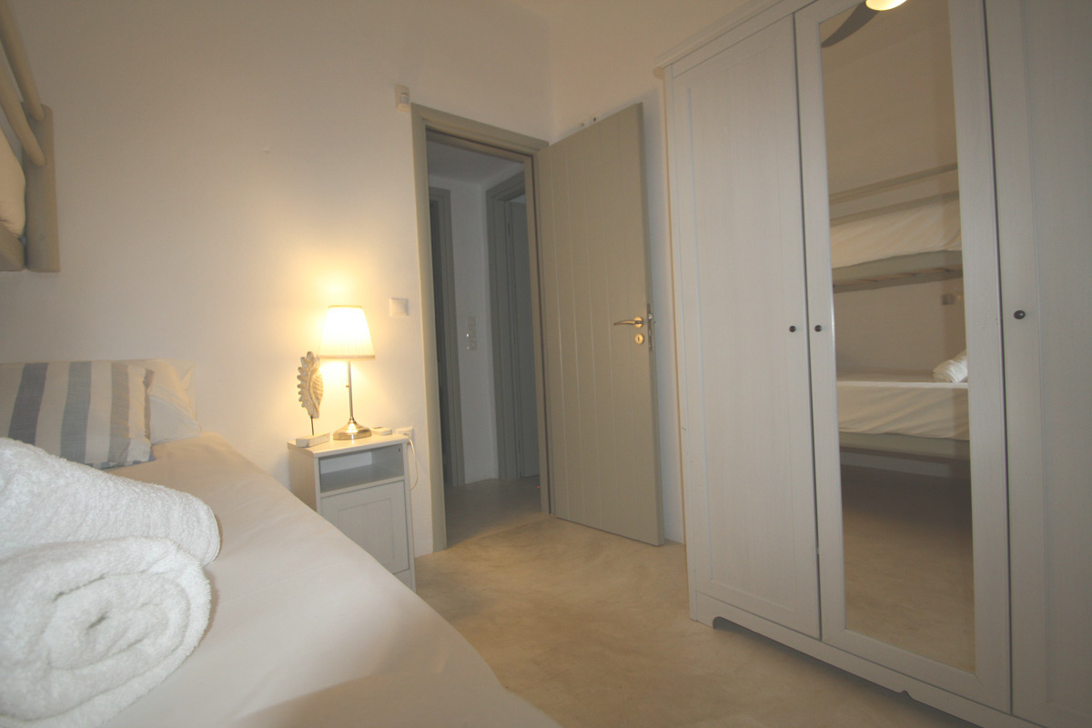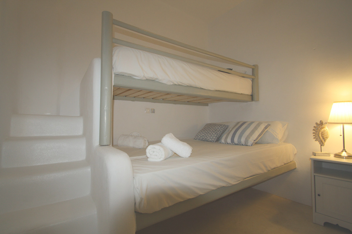 • Ένα υπνοδωμάτιο με κτιστη κουκέτα, ένα ημιδιπλο κρεβάτι 1.40 × 2.00 και ενα μονο κρεβάτι από πάνω 0.90 × 2.00, κοιμίζει τρία άτομα, ανεμιστήρα οροφής, aircondition